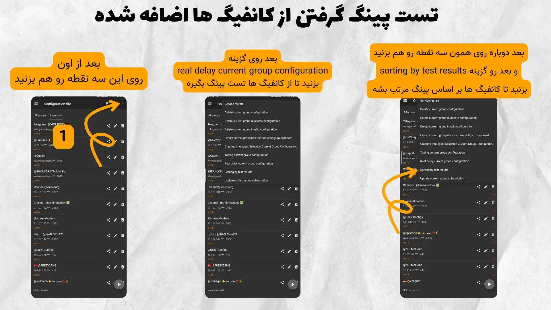 و بعد از اینکه کانفیگ ها دریافت شدن دوباره روی اون سه خط روی هم میزنید و بعد گزینه real delay current group configuration یا به فارسی تاخیر واقعی پیکربندی گروه فعلی ی همچین چیزیه نمیدونم مال من فارسیش کار نمیکنه ، زبون هم برنامه و هم گوشی رو هم فارسی نکردم نشد ، حالا به هرحال از اخر گزینه سوم میشه.