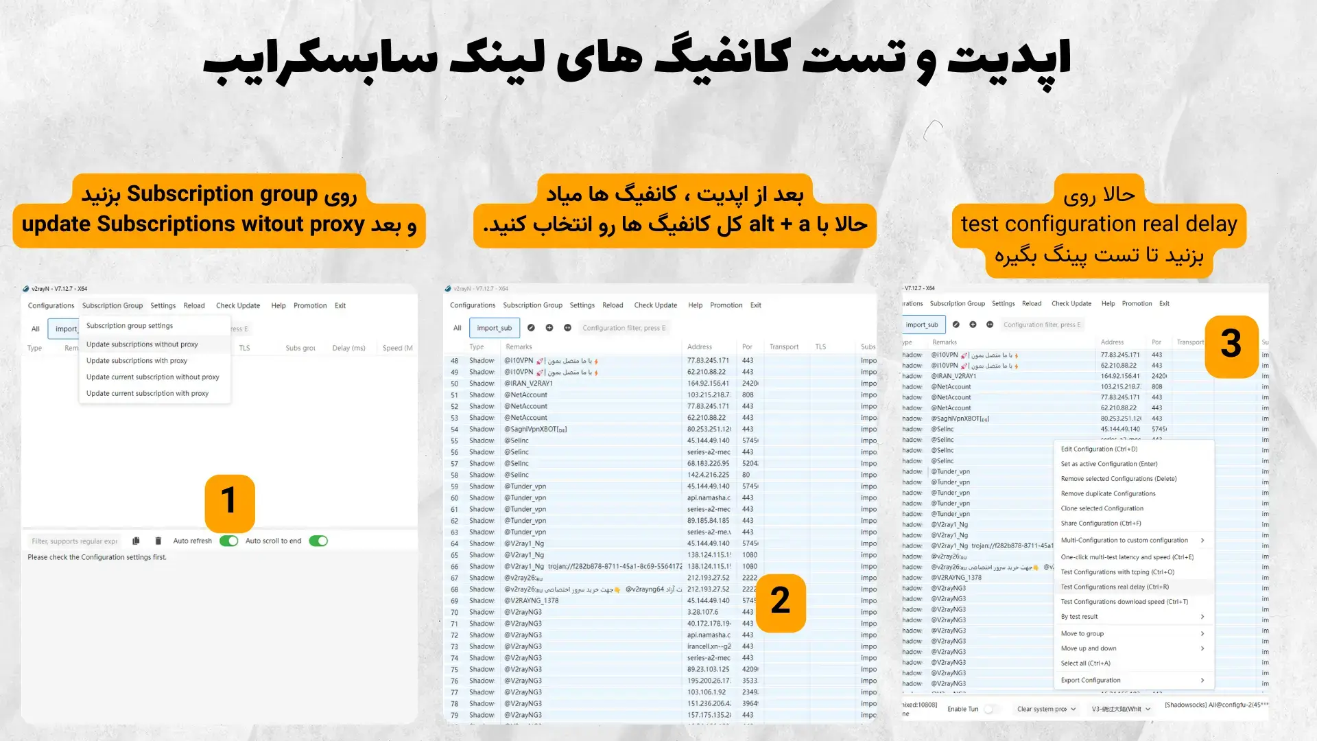 و بعد کل کانفیگ هایی که اومد رو با alt + a انتخاب میکنید و بعد کلیک راست کنید و بعد گزینه test configurations real delay رو بزنید تا تست پینگ بگیره و صبرکنید از کلشون تست پینگ بگیره و بعد از این که تست تمام شد از ستون های بالا روی Delay (ms) رو بزنید تا بر اساس پینگ کمتر مرتب بشه و به کمترینشون با انتخاب و زدن اینترنت کلید اینترنت صفحه کلید وصل بشید.