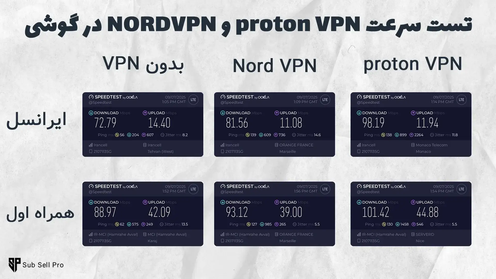 نکته : برای راحتی کار شما و همچنین کم شدن حجم فایل ما تست هردو وی پی ان رو داخل ی ویدیو گذاشتیم و بر اساس گوشی و کامپیوتر تقسیمش کردیم ، داخل ویدیو ها اول اینترنت ایرانسل هستش که پروتون وی پی ان و نورد رو مقایسه کردیم و بعد همراه اول.