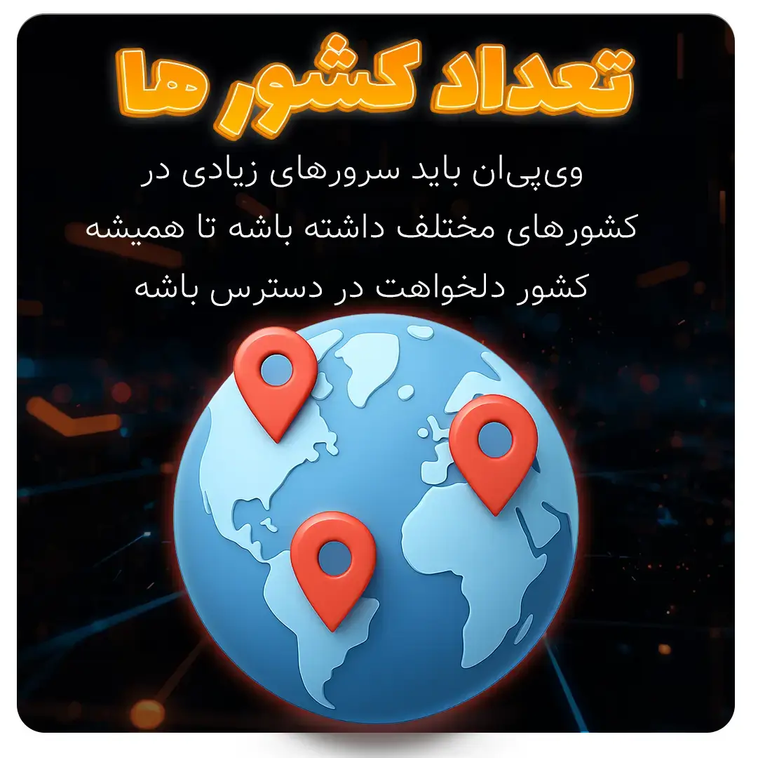 اون وی پی ان که میخواید انتخاب کنید باید کشور های مختلفی داشته باشه تا هم بتونید از بینشون برای کارتون انتخاب کنید و هم این که اون کشوری که میخواید رو داشته باشه. چون با این وضعیتی که داریم تمام کشور های ی وی پی ان برای ما کار نمیکنه و واسه همین باید تعداد کشورهای اون وی پی ان زیاد باشه که بتونید از بینش انتخاب کنید.